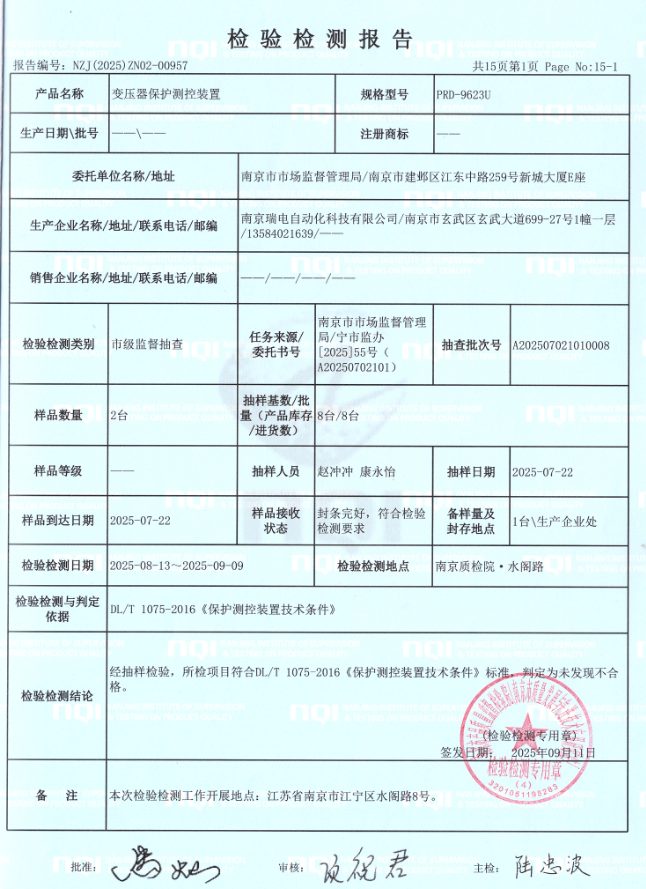 我司2023年9月15日簽收南京市產品質量監督檢驗院抽檢合格反饋通知單及產品檢驗檢測報告。